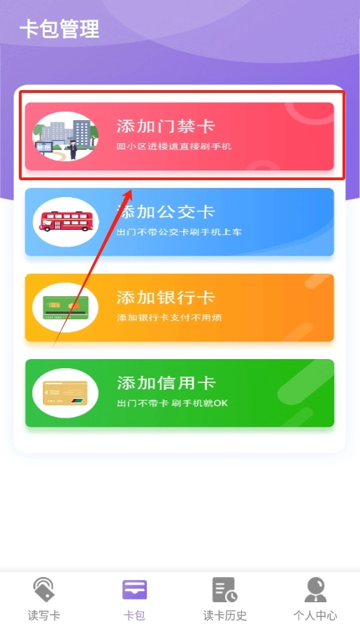 2、当进入卡包页面时,你会看到 “添加门禁卡” 按钮,直接点击该按钮,即可准备录入新卡片。