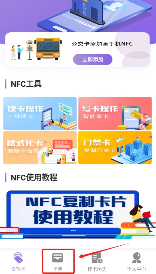 1. 开启nfc门禁卡管家软件,在底部菜单栏中寻找到“卡包”选项,点击该选项即可进入卡包页面。
