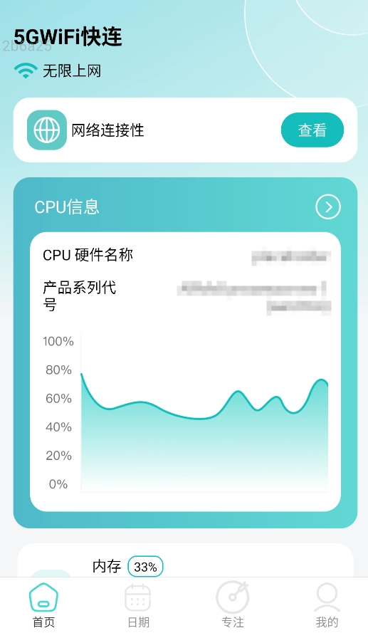 1. 启动 APP 之后,在首页的“网络检测”板块会实时展示当前 WiFi/5G 的信号强度、延迟以及设备 CPU 负载数据。
