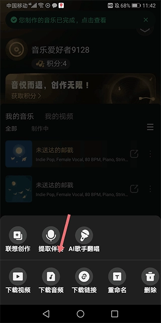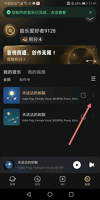 1、在用户的个人作品页面,找到生成的音乐,点击该音乐右侧的扩展功能图标(即下图红色箭头所指之处)。