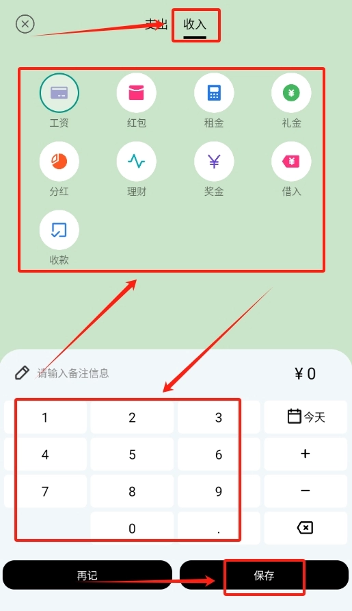 3、记录收入的操作同理,先选好对应的收入类型,填好收入金额,最后点击保存,就能轻松记录收入情况。
