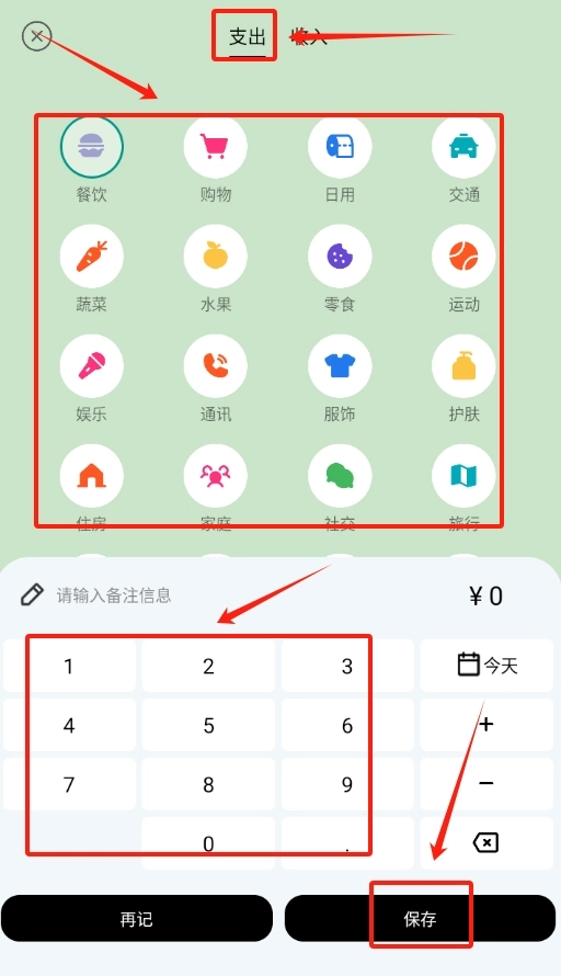 2、若要记录支出,先从各类支出类型中选择一种,接着输入支出的具体金额,确认信息准确无误后,点击保存按钮。
