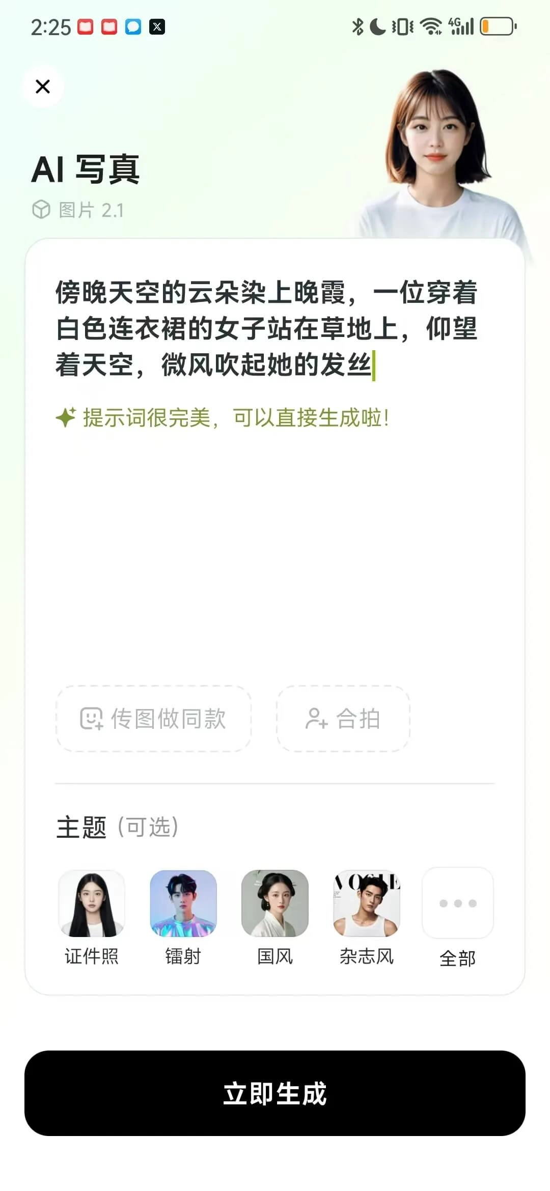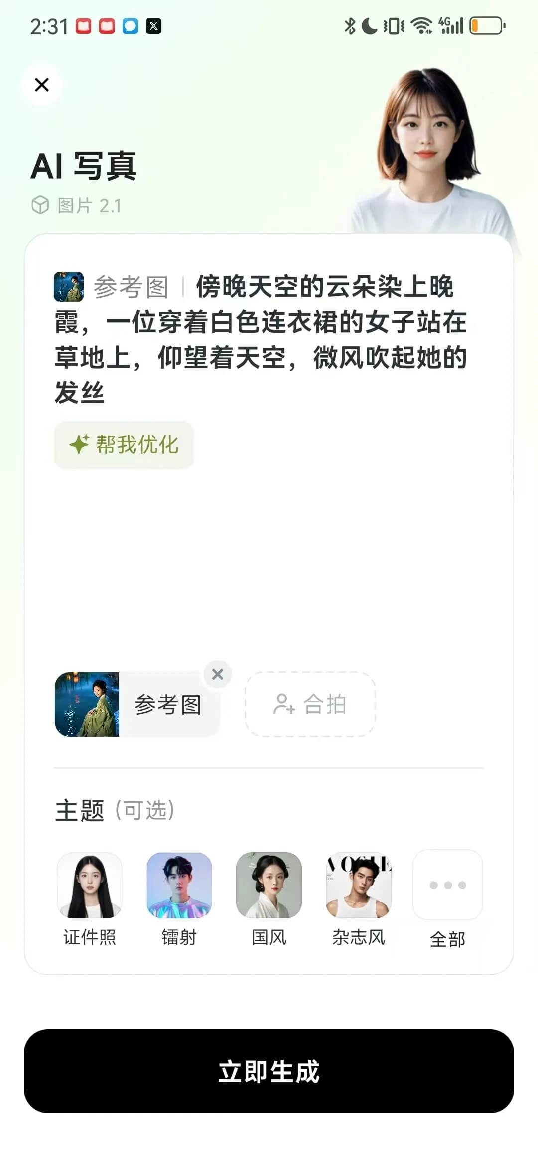 提示词能够随机出现,关键场景会自动丰富,下方主题也能够选择。而传图做同款这个功能就更有趣了,借助该功能,你可以上传任何带有脸部的图片(二次元的也没问题),甚至仅仅是一件衣服的图片,都能当作参考图。