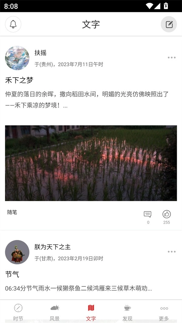 4、进入“文字”页面,你能够看到其他用户分享的知识以及抒发的情感。
