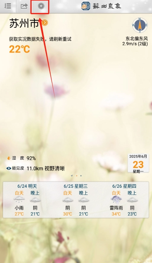 1. 开启苏州气象软件,进入界面后,左上角的加号图标清晰可见,直接点击该图标。
