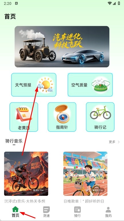 1. 开启行者骑行app,于首页运用丰富功能。比如点击天气预报知晓天气状况,挑选骑行音乐增添乐趣,此外还能浏览骑行博主分享的生活点滴。
