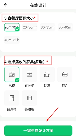 3、进行选择:确定房间面积大小以及需要摆放的家具等相关信息,待选择操作全部完成后,点击【一键生成设计方案】按钮。