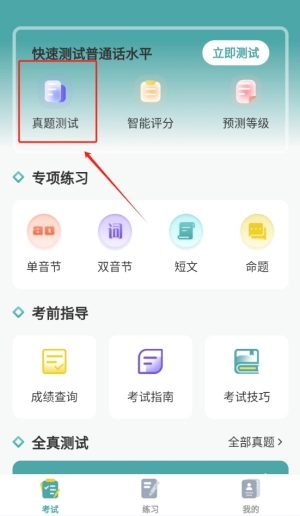 4、全真测试选项,让用户得以参与高度逼真的测试,实时知晓自身普通话水平,为后续强化训练提供依据与方向。
