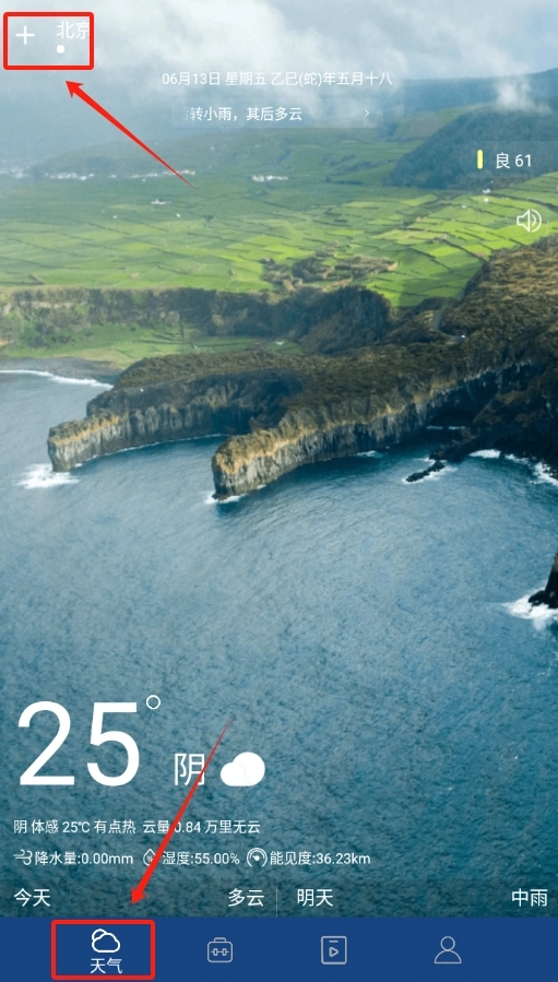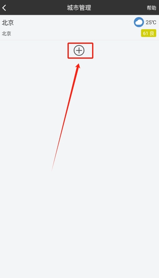 1. 打开软件,在首页能够看到天气信息,页面左上角有一个小小的加号按钮,点击该按钮即可开始相关操作。