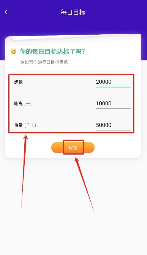 3、于弹出的设置框内,按顺序输入想要的目标步数、距离以及热量数值,输入完毕后,点击右下角的“保存”按钮。