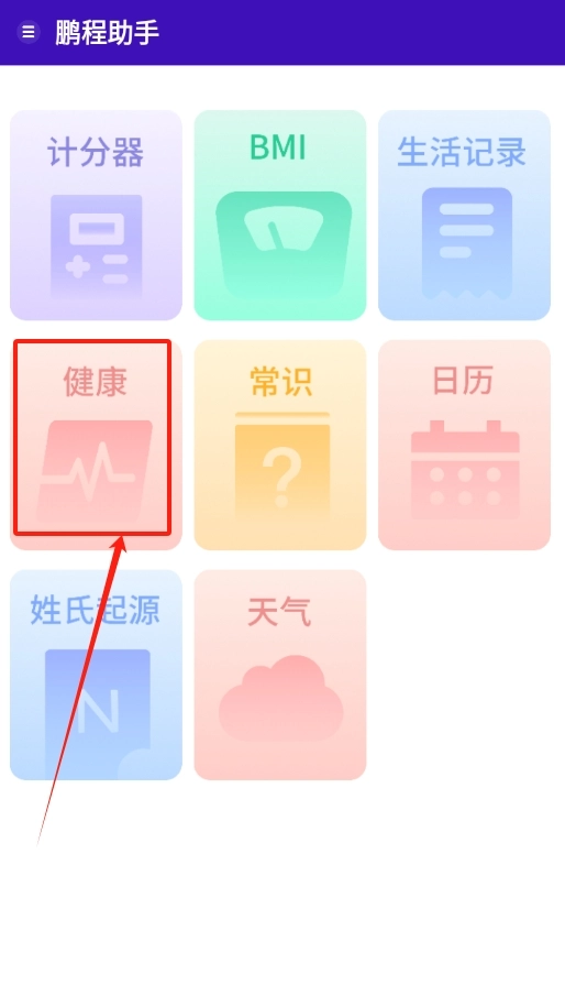 1. 开启鹏程助手软件,首先看到的是各式各样丰富的功能,在这些功能中找到并点击“健康”板块。