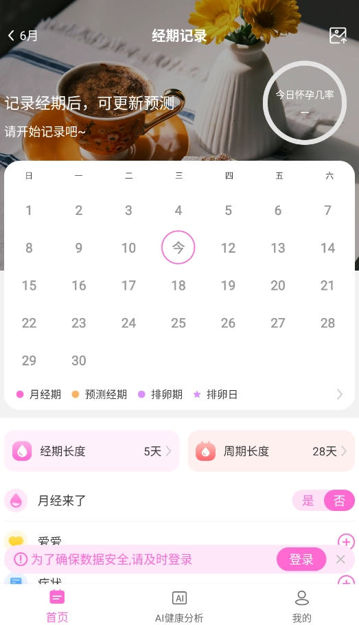 1. 打开月经期助手AI APP,登录账号,在日历上点击标记月经的开始和结束日期。