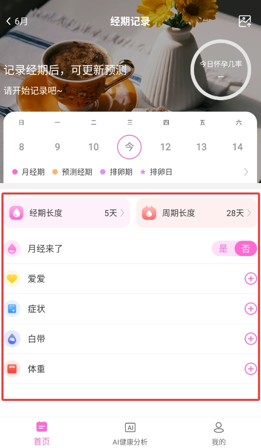 2. 在每次经期开始的时候,点击记录按钮进行操作,系统便会自动计算周期,并对预测数据结果予以更新。