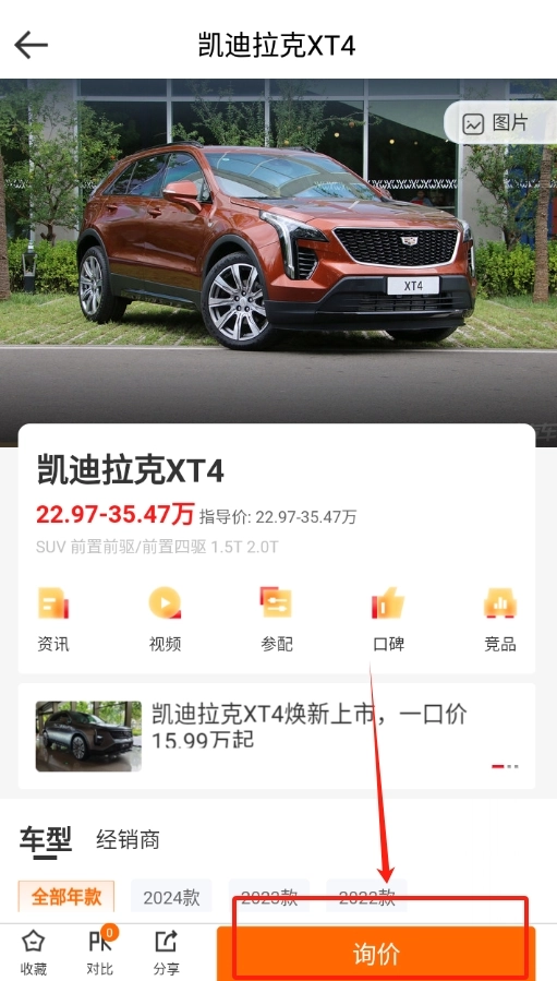2、选定具体的汽车车型后,找到页面右下角的“询价”按钮,点击该按钮即可开启价格询问流程。