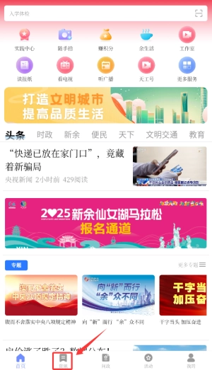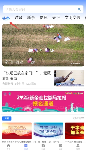 1. 打开天工新余APP,在首页的导航栏中,选中“资讯”频道,此频道每日都会更新本地新闻以及热点动态。