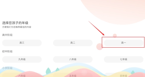 2. 选中红框内“高一”选项,以此设定孩子的年级信息。