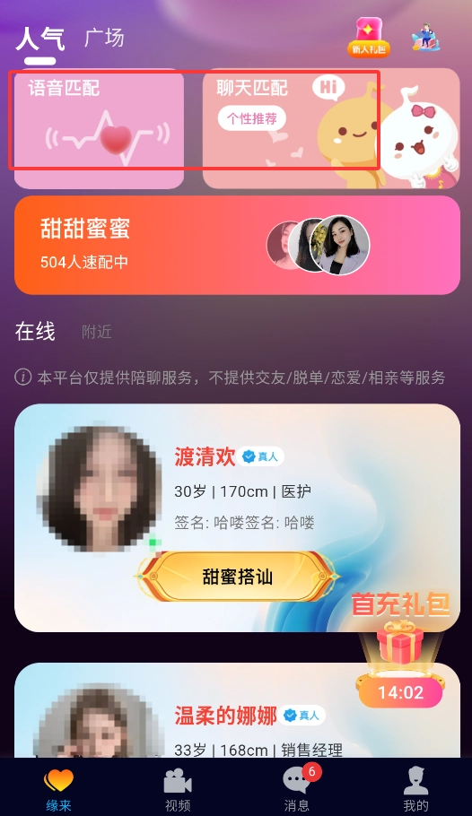 2、首页具备智能匹配功能,用户能够在“语音速配”与“文字聊天”这两种社交模式中进行选择。