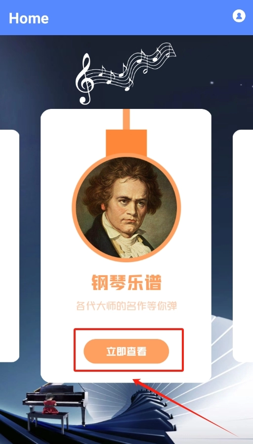 1. 开启软件,于首页即可瞧见“立即查看钢琴乐谱”按钮,点击该按钮进入乐谱页面。