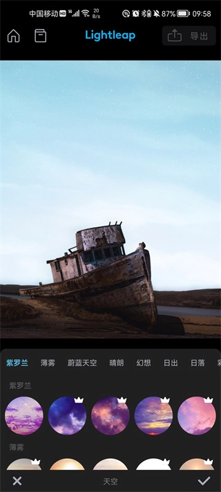 2、接着我们点击天空区域,此处有紫罗兰、薄雾、蔚蓝天空、晴朗等素材风格可供选择,大家可依据自己的照片挑选最为合适的。