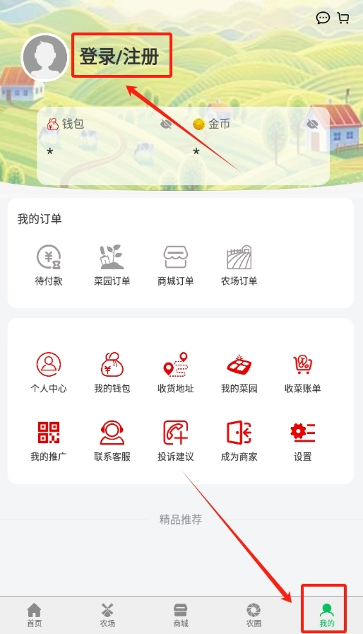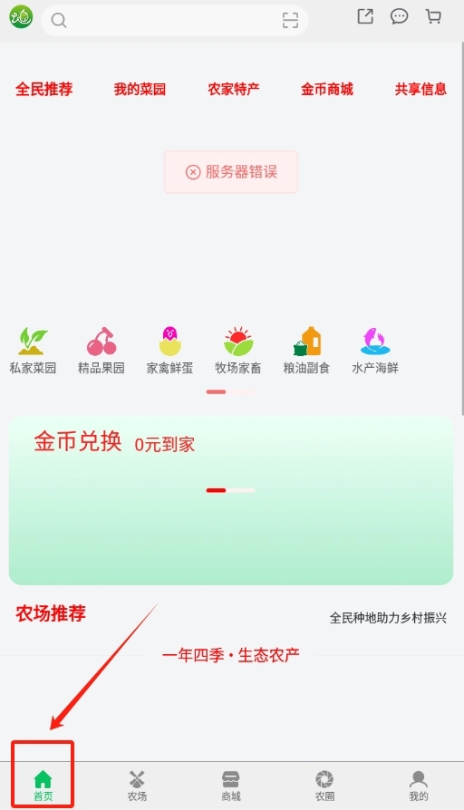 3、成功登录后,会返回软件首页。在这之后,无论是菜地认领,还是商品选购等各类功能,都可以正常使用了。
