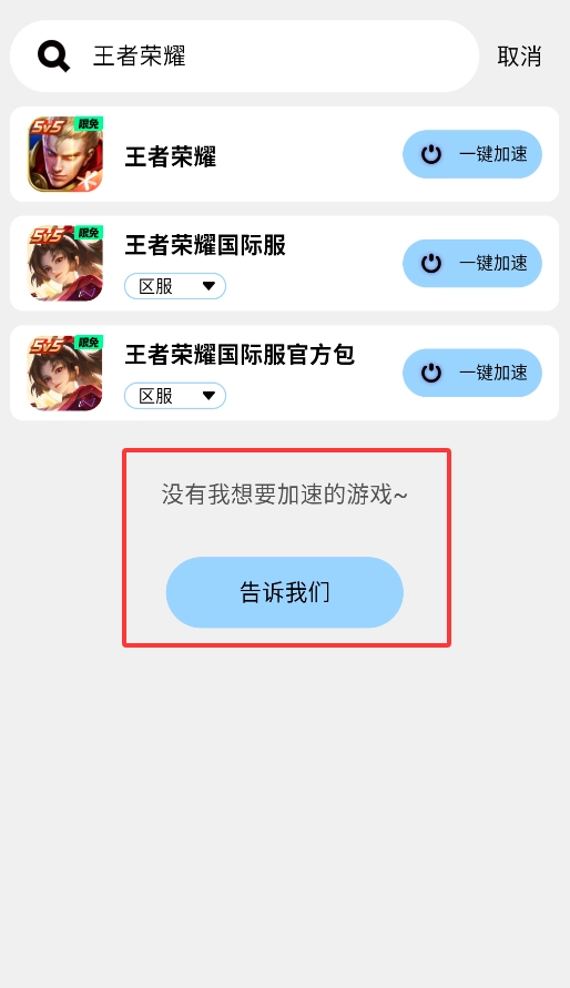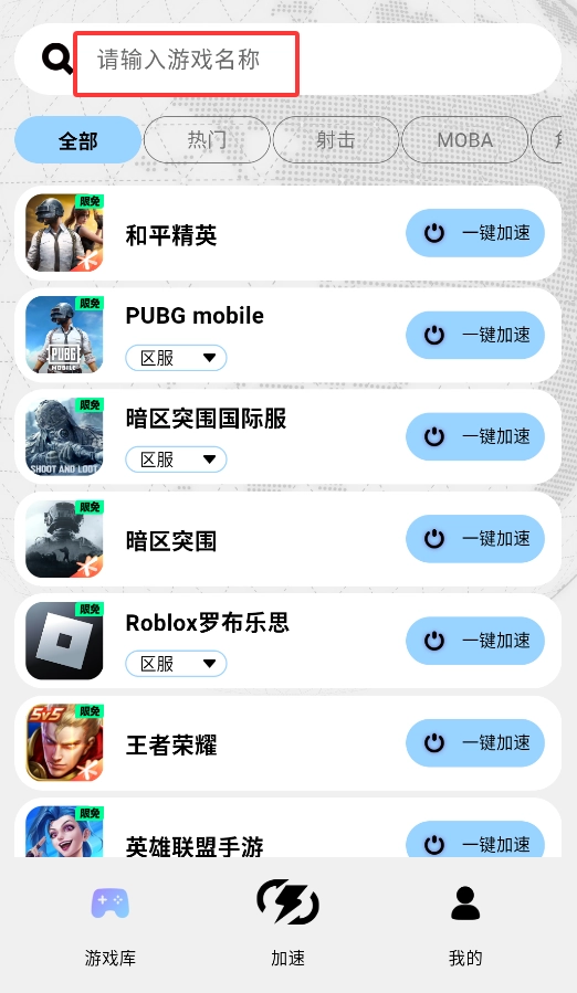 1. 打开APP,在首页的搜索框中输入游戏名称,此时系统将自动匹配与之相关的加速节点。