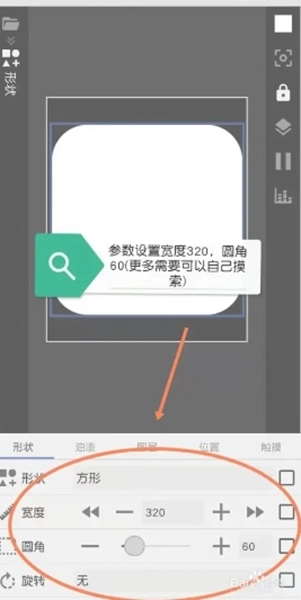 11、参考参数设置:宽度为320,圆角为60(若有更多需求,可自行探索)。
