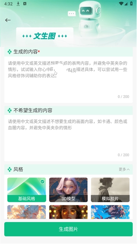 3、找到并点击“AI绘画”选项,在相应区域输入想要生成的具体内容,从提供的风格中挑选自己心仪的,最后点击“生成图片”按钮就完成操作啦。
