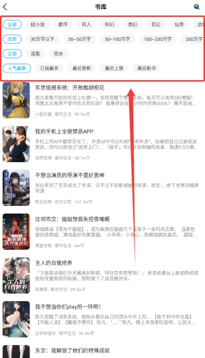2、具备多维度的书籍筛选功能,支持按照字数、更新状态、评分等12种条件进行组合筛选,助力用户精准过滤掉不符合个人偏好的作品。