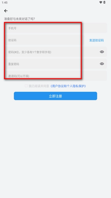 2. 注册时,采用手机号验证码与密码的方式,无需填写邀请码,同意相关协议后点击“立即注册”。