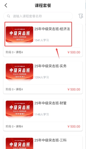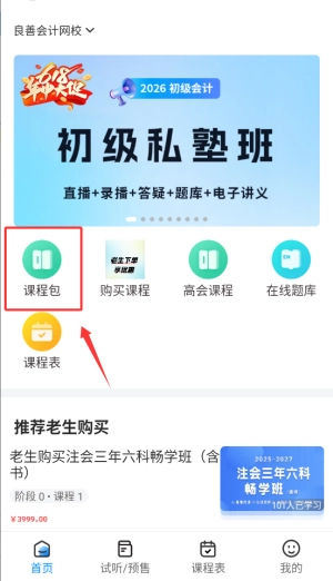 1. 打开良善会计APP,在首页的导航栏里选中“课程包”栏目,该栏目会呈现各类会计培训课程。