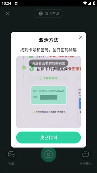 随后,软件会提供激活方法相关的小视频,方便用户观看了解。通常情况下,激活方法可在实体图书的使用手册里找到,在手册中能获取到卡号以及密码,只需刮开密码涂层,密码便会显现。