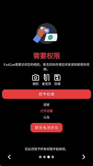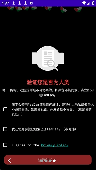 1、安装Fadcam相机,进入软件,点击同意3项权限。