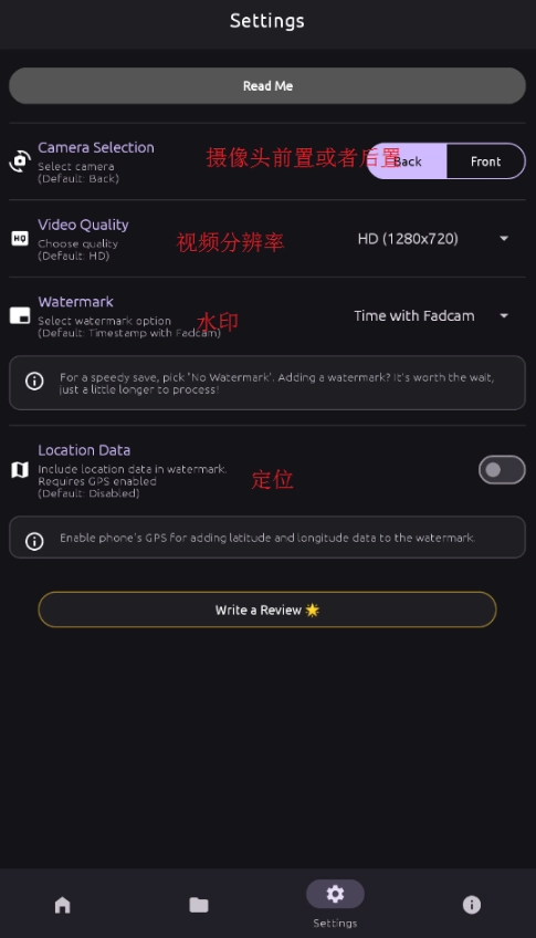 7、设置界面,可以设置摄像头前置或者后置,视频分辨率,水印,定位等等。