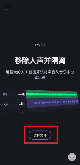 1.该软件提供了多个功能,这里以“移除人声并隔离”为例,点击“选择文件”