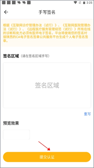 4. 在签名区域写下您的名字,完成书写后点击“提交认证”按钮,随后等待后台进行审核,若审核通过,认证便宣告成功。