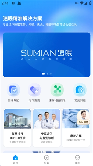 1. 首页:呈现速眠精准解决方案,内容包含测评、案例、科技前沿动态、常见问题解答,同时设有医院、专家、康复方案等睡眠健康服务的入口。