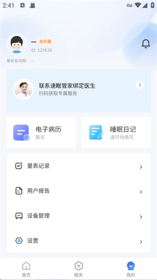 3、我的:提供绑定医生、电子病历、睡眠日记、量表记录、用户报告、设备管理及设置等个人睡眠健康管理功能。