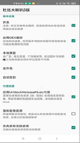 5. 杜比大喇叭拥有清晰的功能选项,它集成了UnblockNeteaseMusic项目,设置好脚本和node文件路径便可开启(将脚本和文件至本机指定位置即可)。