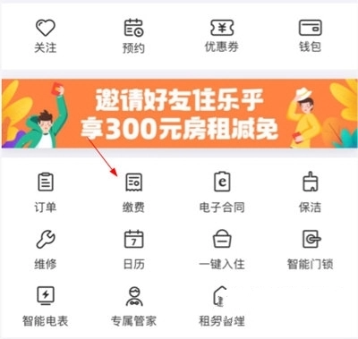 打开个人中心页面后,找到界面里标注的【缴费】选项并点击,就能完成房租的续缴操作。