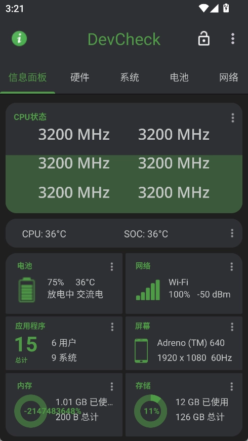 DevCheck Pro 设有信息面板、硬件、电池、系统网络等多个信息板块,功能分类一目了然。