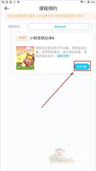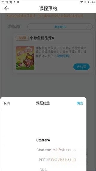 进入课程预约页面后,点击选择课程级别,当前可选的级别有StarterA、StarterB、PREK、GKA、GKB、G1A、G1B、G2A、G2B、G3A、G3B、G4A、G4B、G5A、G5B、G6A、G6B、G7A、G7B、G8A、G8B、G9A、G9B、G10A、G10B。