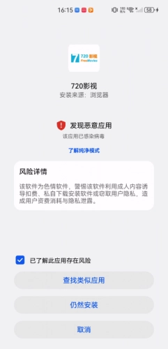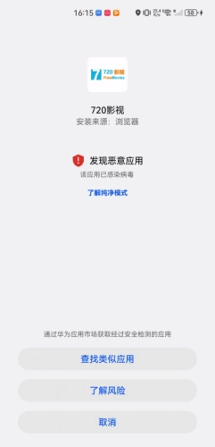系统检测到恶意应用,不排除误判的可能,请点击“了解风险”。