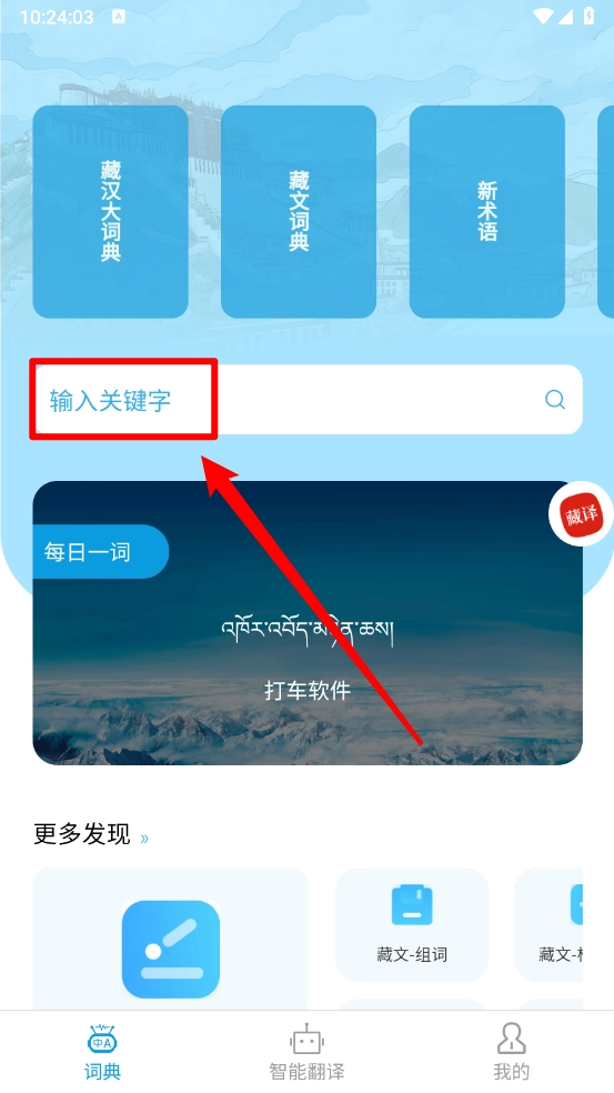 如图,输入关键字即可查询藏文,还支持一键翻译与收藏功能。