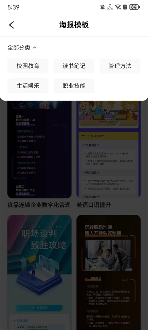 海报模板涵盖校园教育、读书笔记、管理方法、生活娱乐、职业技能等多种类型,可满足各行各业从业者的使用需求。