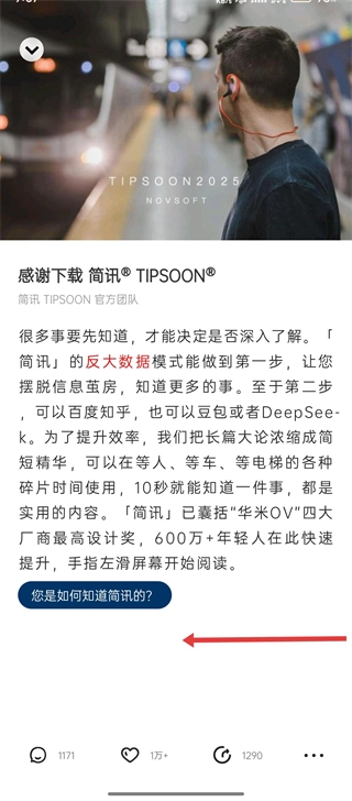 首次使用简讯时,在了解它的【反大数据模式】后,只需用手指向左滑动屏幕,就能开启简短精华内容的阅读之旅。
