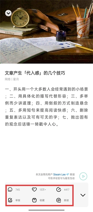 文章底部展开的功能栏里,支持【评论、点赞、分享】操作,同时也提供【举报、收藏、朗读】功能,让阅读体验既丰富又便捷。