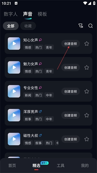 进入【声音】页面后,挑选像【知心女声】这类声音,再点击与之对应的【创建音频】按钮。