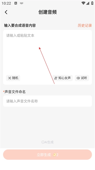 在【创建音频】页面,于输入框中填入文本内容,同时设置好声音文件的名称,随后点击【立即生成】按钮。