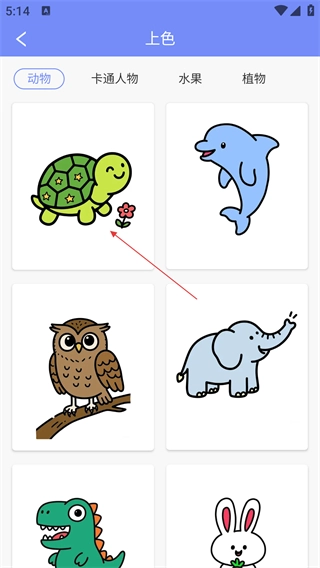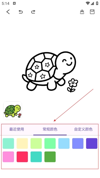 在素材页面选定目标图案(例如乌龟)后,即可进入该图案的上色编辑界面。