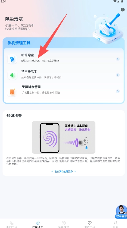 在首页底部的导航栏中,找到并点击“除尘清灰”功能选项,即可进入清净工具页面。